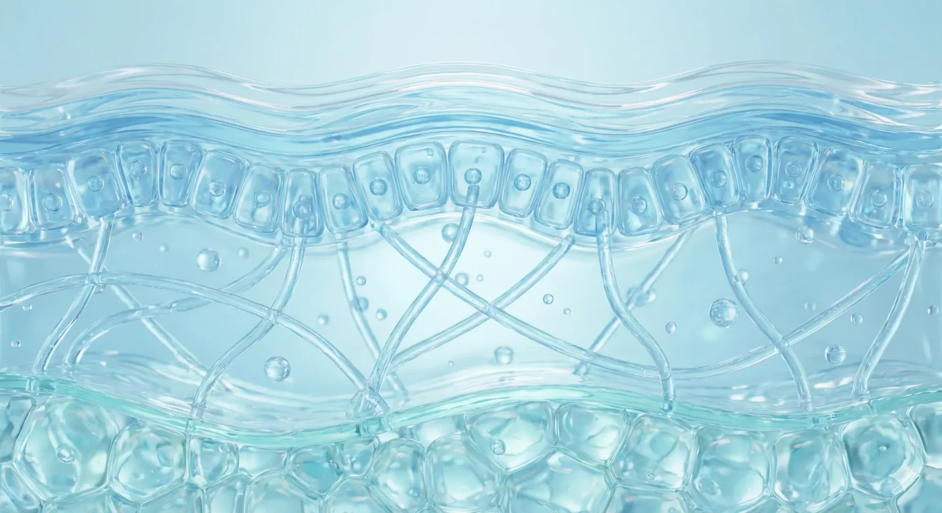 프롬프트블렌더로 만든 뷰티 피부 단층 3D 이미지 만들어줘. 피부 단층을 확대해서 보는 느낌으로 만들어줘. 여러 층의 각 피부 구조가 잘 보이도록 연출해줘. 색감은 히알루론산처럼 투명한 하늘색을 활용해줘