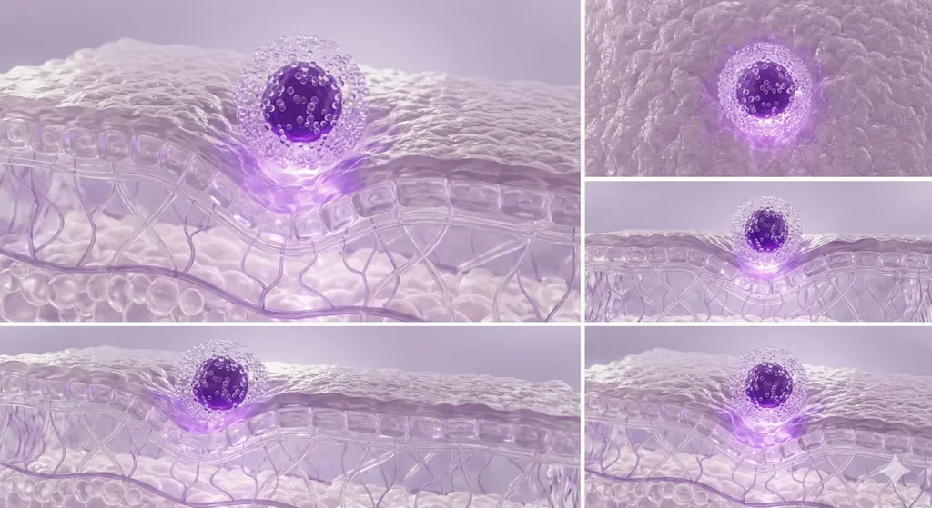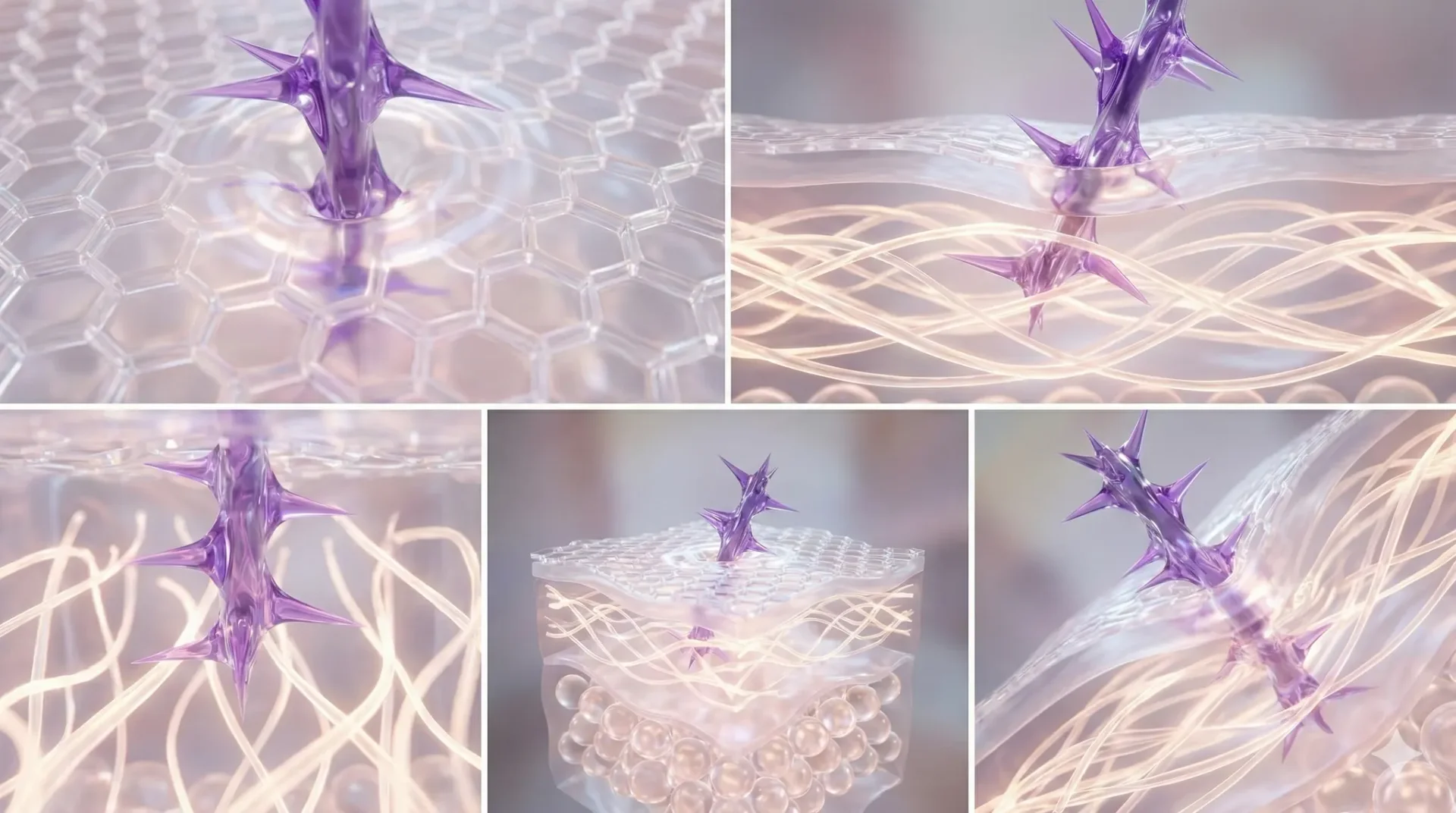콜라겐 입자 1개가 피부에 스며드는 듯한 느낌의 뷰티 피부 단층 3D 이미지 생성해줘. 피부 단층을 확대해서 보는 느낌이고, 여러 층의 각 피부 구조가 잘 보이도록 연출해줘. 각 층의 피부 구조는 너무 현실적이지 않고 깔끔하고 반투명한 이미지로 만들어줘. 콜라겐 입자는 2중으로, 안쪽은 짙은 보라색, 바깥쪽은 투명한 연보라색의 파티클 입자가 있는 구조로 만들어줘. 5개의 카메라 구도로 이미지컷 5개 만들어줘