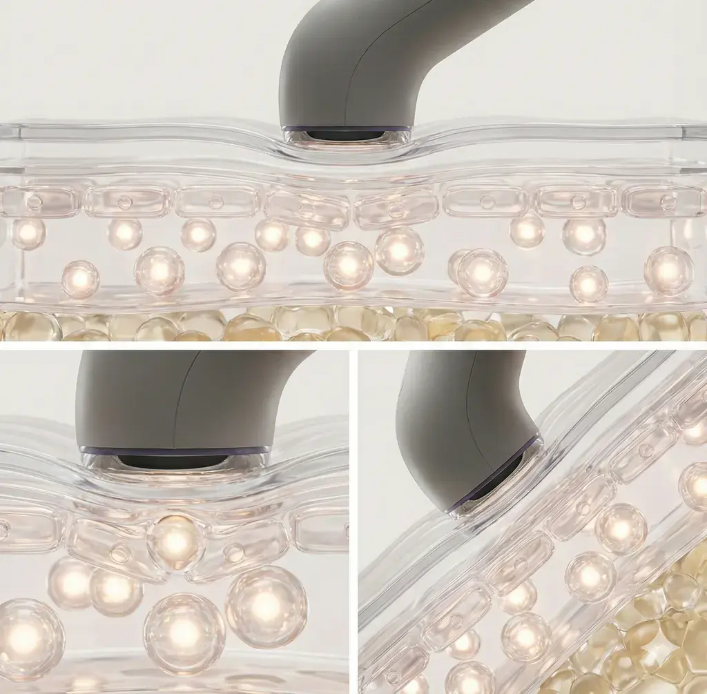 이 제품의 회색 면을 피부 표면에 문지르고 있는 듯한 3D 뷰티 디바이스 사용 이미지 5장 생성해줘. 피부 단층을 확대해서 보는 느낌이고, 여러 층의 각 피부 구조가 잘 보이도록 연출해줘. 각 층의 피부 구조는 너무 현실적이지 않고 깔끔하고 반투명한 이미지로 만들어줘.